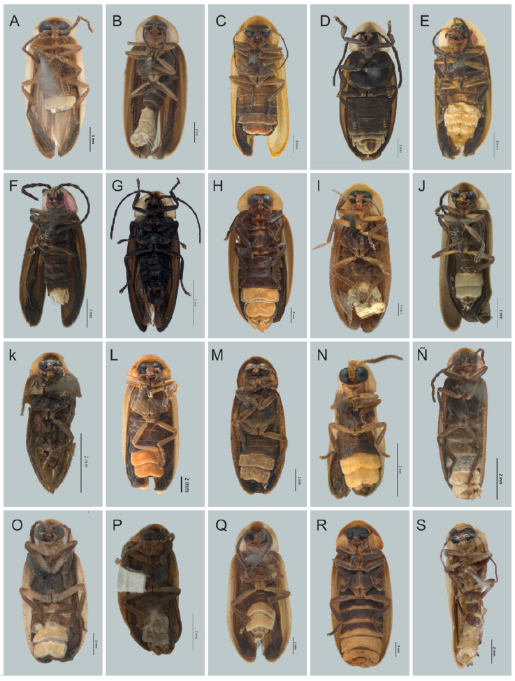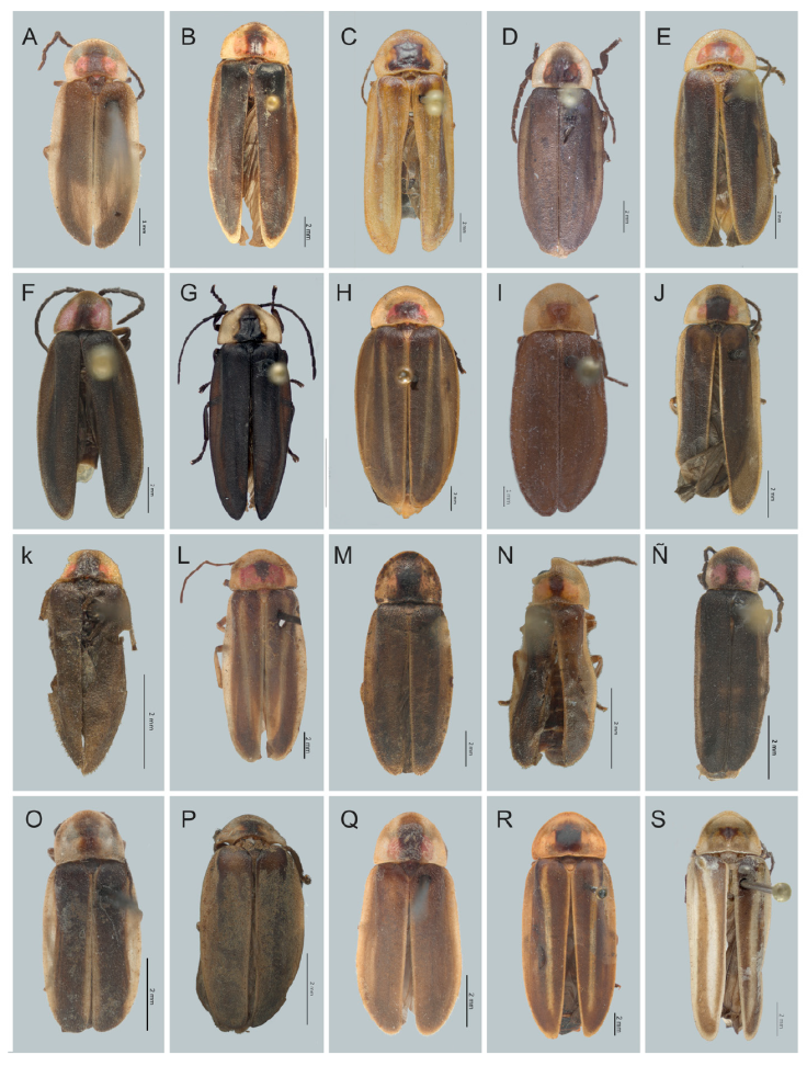 Para las especies previamente registradas en la región y que no aparecen en la publicación de Zaragoza-Caballero et al. (2020) y Zaragoza-Caballero, López-Pérez et al. (2023), se ilustra el hábito en vista dorsal y ventral, asimismo se muestra un ejemplo de los genitales masculinos para aquellos géneros que se encuentran en la región y que tampoco aparecen en los trabajos antes mencionados. De las especies ya antes registradas en la región: Amydetes fastigiataIlliger, 1807, Aspisoma lepidum (Gorham, 1881), A. yucatanum Olivier, 1908, Bicellonycha facialis (Gorham, 1881), Cratomorphus leoneliLima et al. 2021, Lucidota diaphanuraGorham, 1881, Phaenolis mexicanaMcDermott, 1958, Photinoides bidenticauda (McDermott, 1958), Photuris trivittata Lloyd y Ballantyne, 2003, Photinus affinisGorham, 1880, P. albicaudaGorham, 1881, P. ampliatusOlivier, 1907, P. cordovaeGorham, 1881, P. parvulusGorham, 1881, Pyractomena striatellaGorham, 1880, P. vexillariaGorham, 1881 y Vesta thoracica (Olivier, 1790), no se ilustran en fotografías debido a la falta de material; las diagnosis y datos de éstas se recuperaron de las descripciones originales. Para las especies nuevas se ilustra su hábito dorsal y ventral, así como los genitales masculinos. Para la revisión de los ejemplares, la separación del edeago en machos y la toma de medidas se utilizó un microscopio estereoscopio Carl Zeiss™ Discovery V8; las medidas se expresan en mm. Todas las especies de Photinus fueron medidas en el largo y ancho total (LT, AT), largo y ancho del pronoto (LP, AP), largo y ancho de los élitros (LE, AE), largo de las antenas (LA), distancia interocular (DI), distancia interantenal (DIA) y largo y ancho del ojo (LO, AO). Asimismo, se obtuvieron las proporciones largo y ancho de los élitros (LE/AE) y largo de los élitros y largo del pronoto (LE/LP). Los datos anteriores permiten establecer las categorías: chica, corta, mediana, larga y grande en las especies (Zaragoza-Caballero, López-Pérez et al., 2023).