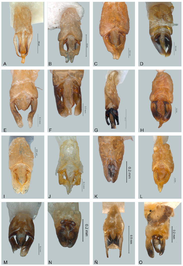 Este estudio se limita a las especies distribuidas en Tamaulipas, Veracruz, Tabasco, Campeche, Yucatán y Quintana Roo, que forman la región golfo-Caribe (Fig. 1). Las nuevas especies se reconocieron a partir del estudio morfológico de 36 ejemplares machos depositados en la Colección Nacional de Insectos (CNIN) del Instituto de Biología, UNAM, igual que el resto de los ejemplares pertenecientes a las especies ya descritas. Todos los ejemplares quedaron depositados en la CNIN.
