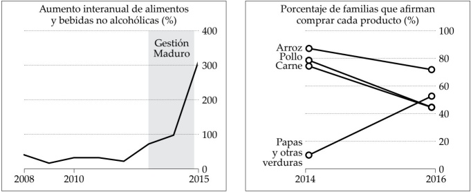 Por otro lado, la crisis económica tuvo su principal impacto inmediato en la realidad cotidiana de la sociedad venezolana. Por ejemplo, la gráfica 4 nos muestra cómo el aumento de alimentos y bebidas produjo un cambio sustancial en la dieta alimenticia de los venezolanos. La inflación llegó a ser del 181 % en 2015 y del 200 % en 2016 (Puente y Rodríguez, 2016). A través de una encuesta llevada a cabo en 2015 por ONGs y dos universidades venezolanas, se determinó que el 87 % de los entrevistados en el país -en su mayoría de hogares de bajos ingresos- tenían dificultades para comprar alimentos (Human Rights Watch, 2016).