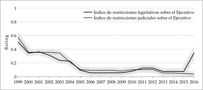 En el índice legislativo se observa una mejora al 2016 comparado al 2009. La elección legislativa de diciembre de 2015 evidencia esta mejora, pero a partir del freno al referendo revocatorio y de la decisión del TSJ en marzo de 2017 al atribuirse las competencias del parlamento, podría esperarse que el índice para el año 2017 se muestre significativamente menor que el índice de 2009. En el caso del índice judicial, se observa una tendencia gradual de abandono de su facultad de poner restricciones al Ejecutivo.
