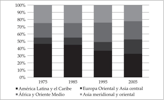 Como puede apreciarse en la gráfica 1, el 47 % de la deuda externa mundial1 recaía en AL en 1975. En adelante, la región logró reducir su peso de manera progresiva hasta tener en 2005 el 29 % de la deuda externa del mundo. En el caso de ASS, la participación de su deuda externa se ha mantenido en torno al 12 %, con oscilaciones de entre el 3 y el 6 %, al analizarse en 1985, 1995 y 2005.