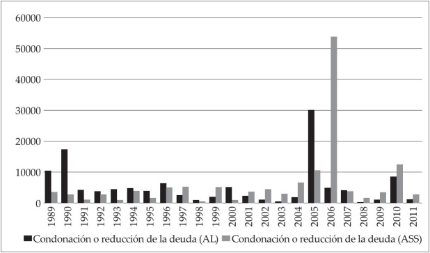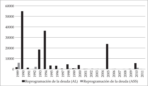 En términos absolutos y en porcentaje respecto al total de la deuda, tal y como se observa en la Gráfica 8, desde 1989 y hasta 2011, se reprogramó de manera anual más deuda en AL que en ASS. En total, en AL se reprogramaron 150 mil millones de dólares frente a los 12 mil en ASS. El acumulado del porcentaje reprogramado cada año ascendió en AL al 31 % y al 7 % en ASS. Esto se explica porque la mayor parte de la deuda de AL era con los bancos, al contrario que la deuda de ASS, como se indica en la Gráfica 7, que era con otros países.