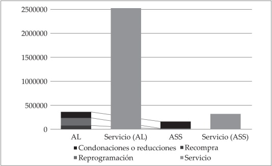 A modo de resumen, como se indica en la gráfica 10, se observa cómo en AL la reprogramación de la deuda junto a la aplicación de los PCCR supuso la reducción del 73 % del servicio de la deuda, quedando la recompra de deuda en tercer lugar. En ASS, el gran rubro que impulsó la reducción del 50 % del servicio de la deuda en ASS, de 318 mil millones de dólares, se generó a partir de la aplicación de los PCCR.