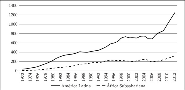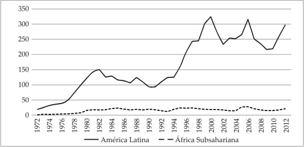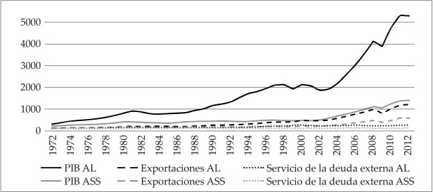 Al comparar el servicio de la deuda externa3 en AL y en ASS, tal y como se indica en la gráfica 3, se observa cómo tanto en valores absolutos como per cápita, ha aumentado más en AL y ha supuesto un mayor peso sobre el PIB y las exportaciones. El pago anual de la deuda en AL ha sido entre seis y 12 veces el pago en ASS durante todos los años desde 1972 y hasta 2012.