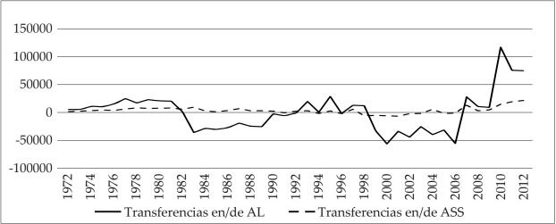 Como se indica en la gráfica 6, al analizar las transferencias netas de deuda externa4 AL pagó a sus acreedores 3,870 millones de dólares más de los que recibió desde 1972 y hasta 2012. En el caso de ASS el saldo resultó positivo para región, habiendo recibido 120,017 millones.
