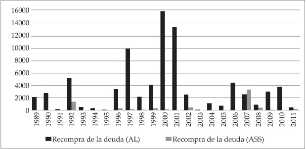 El Plan Brady tuvo más éxito que los Planes Baker (Azcona, 2001), con ejemplos destacados como el de Chile, que recompró el 18 % de su deuda, como señala la OCDE (1999). En términos absolutos, tal y como se observa en la Gráfica 8, desde 1989 y hasta 2011, se recompró más deuda en AL que en ASS cada año, alcanzándose en AL 79 mil millones de dólares frente a los siete mil recomprados en ASS. En porcentaje, en cambio, se compró en ASS más sobre el total de la deuda externa acumulada que en AL.