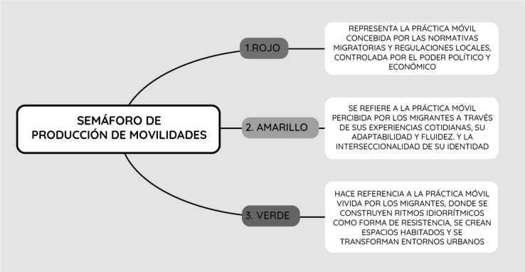 El semáforo de movilidad en el contexto de la migración en tránsito proporciona una visión integral de cómo los migrantes interactúan con los espacios urbanos. Esta herramienta permite comprender la interacción entre el espacio concebido, percibido y vivido, centrándose en la práctica móvil migrante como objeto de estudio principal.