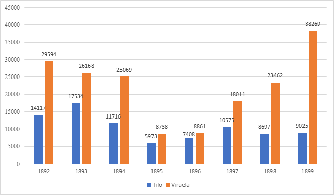 Figura 1 Muertes por tifo y viruela en México, 1892-1899