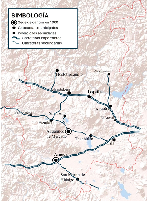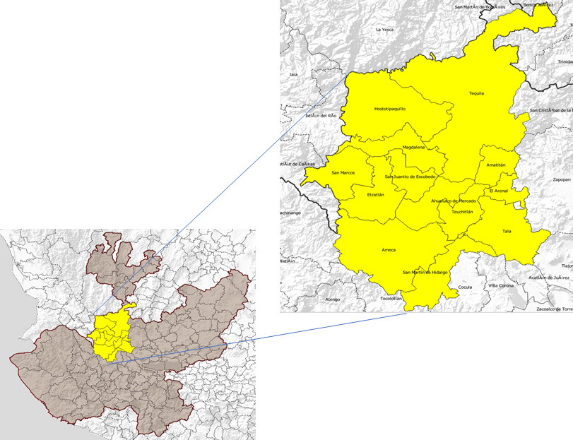 Lejos de ser un cúmulo de municipios elegidos al azar, el área estudiada corresponde en términos actuales a la región Valles de Jalisco, misma que, desde el periodo colonial se fue configurando a nivel político y administrativo y quedaba dentro del área de abasto de productos primarios de la ciudad de Guadalajara (Argumaniz, 2013), sufriendo pocos cambios en sus límites durante el siglo XIX. Para 1900, los municipios de estudio se agrupaban en dos unidades administrativas: el V cantón con sede en Ameca y el XII cantón cuya sede era la ciudad de Ahualulco de Mercado y luego pasó a Tequila (Goyas, 2010; Peñafiel, 1905). En lo económico, para 1900 el área aquí analizada se distinguía dentro del estado de Jalisco por su agricultura de riego y sus actividades agroindustriales sustentadas por importantes haciendas. Además de maíz, fríjol, trigo y ganado bovino, se producía alcohol de caña, piloncillo, azúcar y vino-mezcal (luego llamado “tequila”), lo que la enlazaba con mercados de importancia como Guadalajara y la ciudad de México.