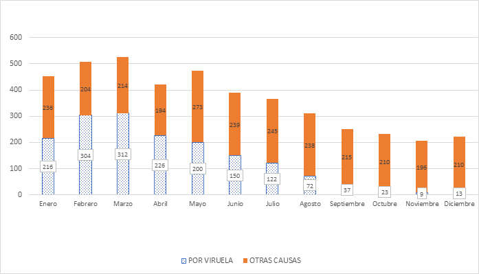 Como se puede observar en la Tabla 1, en 1900 se registraron en total 4 358 muertes en los 10 municipios jaliscienses analizados. De estas, 1 684 lo fueron por causa de la viruela. Dicho de otra forma, alrededor de cuatro de cada diez muertes lo fueron por la viruela. Nótese cómo la viruela fue un factor esencial para disparar el número de muertes en ciertos meses, en este caso, en la primera mitad de 1900. Por el contrario, como se puede observar en la Figura 5, en el cuatrimestre de septiembre-diciembre de 1900 se presentaron solo 82 muertes por esta enfermedad.
