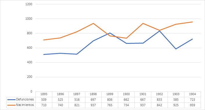 Fuente: elaboración propia con base en: Ameca, Jalisco, Juzgado del Registro Civil, “Defunciones 1895-1904“; “Nacimientos, 1895-1904“, datos provenientes de FamilySearch (https://www.familysearch.org/es/global).
