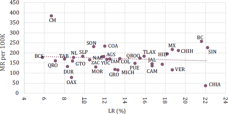 Figure 2, in turn, presents the scatter points between the mortality and lethality rates across Mexico’s federal entities14. As can be observed, Mexico City was by far the entity with the largest mortality rate with more than 384 persons per each 100,000 inhabitants; yet it presented one of the lowest lethality rates within the country (6.7%). Baja California, which ranked second in terms of mortality (258.3), was, at the same time, one of the entities with the largest lethality rates (21.6%). Chiapas and Oaxaca, on the other hand, exhibited the lowest mortality rates, 37.1 and 78.6 out of 100,000 inhabitants, respectively. Their performance in terms of lethality rates, however, were quite dissimilar: while Oaxaca showed a lethality rate below 9 %, Chiapas presented the second highest rate with 22 %15. This is rather intriguing, because both federal entities have the same socio-economic characteristics, i.e., both have many very small municipalities (less than 15,000 inhabitants each), with a high degree of marginalization.
