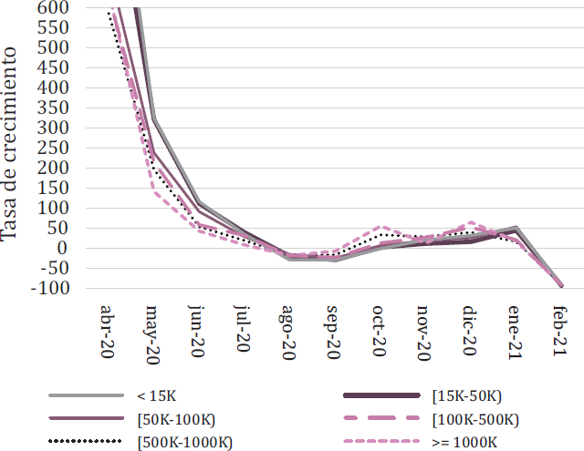 Like many other countries, by the end of February 2021 Mexico had experienced at least two waves of high rates of contagion and deaths. Figure 3 and Figure 4 present the monthly growth rate (MGR) of both contagion and deaths for municipalities of different sizes. The first wave went until August, when the MGR of new positive cases and deaths became negative in most of the municipalities (Figure 3)19. The second wave started in November and lasted until January 2021. In short, the behavior of the virus infection and deaths, over time, seems to have been quite similar across localities of different population’s size except for deaths in very large municipalities which had controlled the death toll during the first wave. It is important to note that by the end of December 2020, Mexico’s government began its national vaccination plan against COVID-19. The first ones to receive the vaccine were Health Workers dealing with the disease. Older people were next, and the campaign continued during the following months, so by the end of September 2021, 97.5 million doses had been administered.