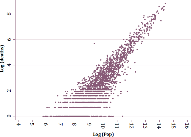 We now turn to the analysis of the relationship between the number of deaths and different social and economic indicators. Figure 5 shows the relation between municipalities’ size and the number of deaths (in logs). There is a clear positive relation between the number of deaths and the size of the municipality; moreover, the larger the municipality size the higher the number of deaths.