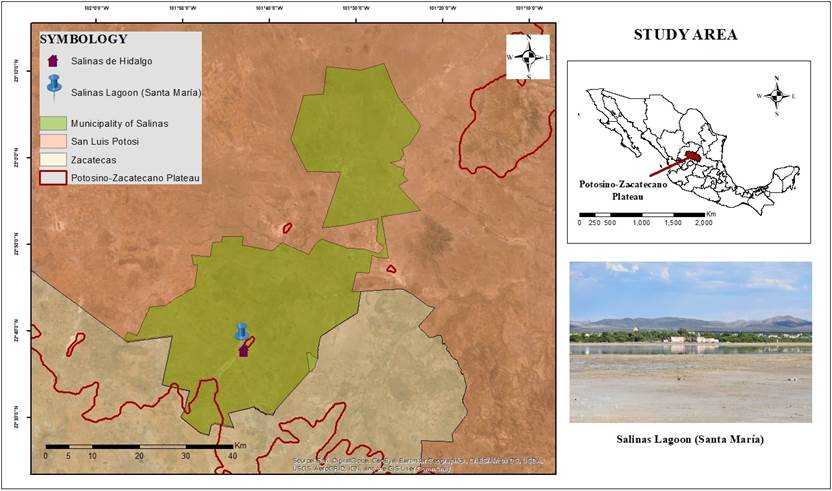 Our observations were conducted in Salinas Lagoon, also known as Santa María Lagoon, adjacent to the urban area of Salinas de Hidalgo, San Luis Potosí, Mexico (Figure 1). This area occurs within the biogeographical sub-province of the Potosino-Zacatecano Plateau, which is found in the central and western part of the state. There is a scarcity of water in the state, and waterbodies are scattered and temporal, as they depend on precipitation from the previous year (Luévano et al. 2010), and may totally evaporate during severe drought episodes. Salinas Lagoon is a salty water lagoon that is one of the most prominent waterbodies in the municipality, and bears water for most of the year.