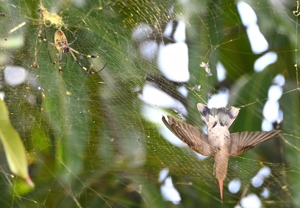 Figura 1 Colibrí Oscuro (Phaeoptila sordida) atrapado en la telaraña de la Araña de Seda Dorada (Trichonephila clavipes). Foto: M. Castro-Torreblanca, 13 octubre 2023.