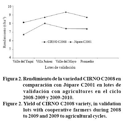 Esta variedad se evalúa principalmente en el Campo Experimental Norman E. Borlaug (CENEB), INIFAP; en el Valle del Yaqui, Sonora durante los ciclos 2006-2007 al 2008-2009, con rendimiento experimental promedio de 5.6 t ha-1 con dos riegos de auxilio y de 6.3 t ha-1 con tres riegos de auxilio, con un rendimiento 8% superior a la variedad comercial Júpare C2001 (Figura 1). En lotes de validación con agricultores cooperantes los rendimientos de la variedad CIRNO C2008 fue superior a la variedad comercial en más de 0.8 t ha-1 (Figura 2).