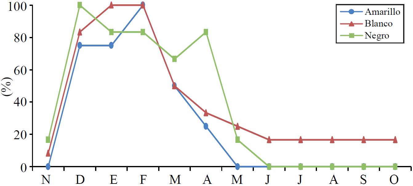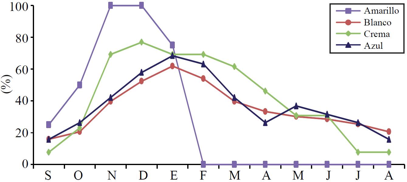 Some notable behaviors are in the state of Tlaxcala the black, cream, white and yellow colors have a higher proportion of marketing; almost purple is for their own consumption and that a higher proportion is intended for livestock is yellow. It should be clarified that while the percentage for seed is very low, actually the seed producers select the proportion earmarked for consumption and it is not easy to quantify. The Figures 2, 3 and 4 show the months when there is availability of grain for sale. Because corn colored cultivated producers the study areas are temporary regime, variation of sowing cycle and harvest are determined by the rainy season, the type of grain and weather conditions.