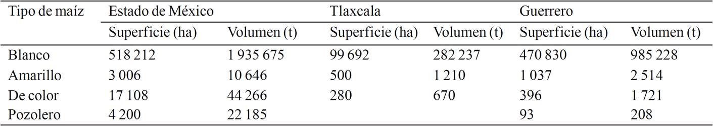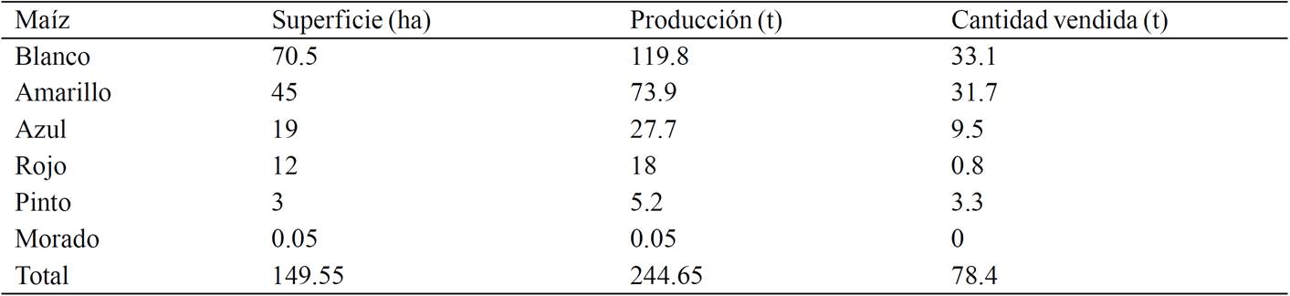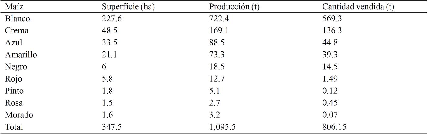 Table 4. Area sown (ha) and production volume (t) of specialty maize producers interviewed in the State of Mexico and the states of Tlaxcala and Guerrero.