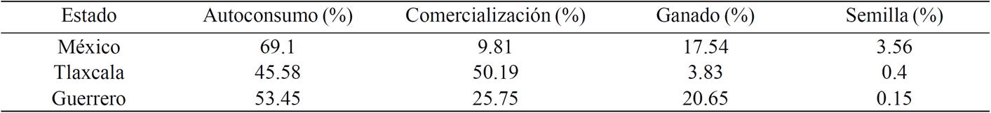As for the fate of production, it was found that the distribution for each state is different; however, the predominant use of maize for their own consumption. In the State of Mexico and Guerrero there is a significant share of the corn is used to feed livestock. Tlaxcala and Guerrero are the states that have most developed marketing, it is noteworthy that in the state of Tlaxcala more than 50% of production is marketed. While the use seed has a marginal share ranging from 0.15 to 3.56%.