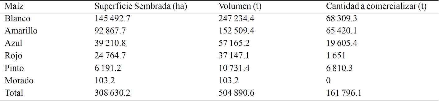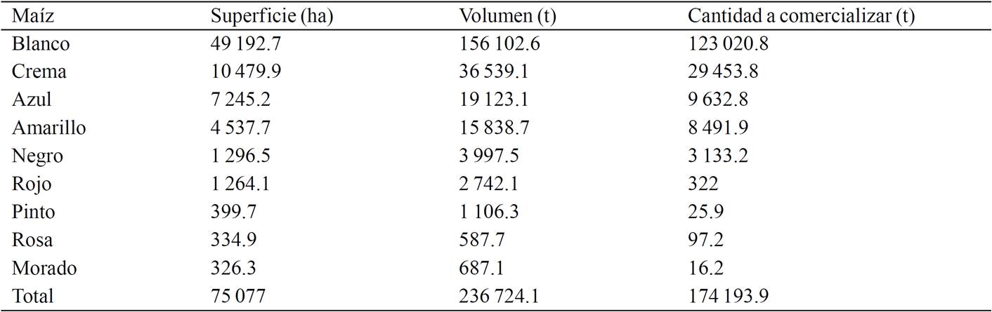 The volume produced in native maize in the state of Tlaxcala is about 1 100 t; of which 73.6% is marketed. Therefore, we can say that the supply of maize color is equal to 806 tons represented 88 producers. However, the potential supply will be determined by all producers of native corns state. For the potential value of the offer, the steps followed in the materials and methods section obtaining the values shown in Table 8. The total maize area is 100 472 ha (SIAP, 2015); 65 306 of which corresponds to native maize varieties.