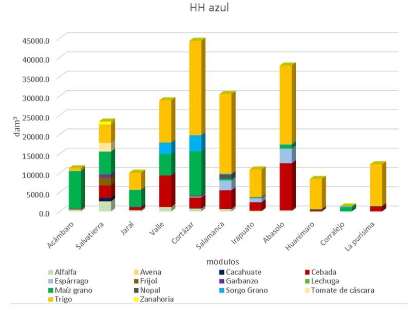 Figure 5 shows the distribution of blue WF by crop in each module of DR 011, showing the weight of blue WF (dam3) of the total production of wheat, corn, and barley crops, which together account for 85.8% of the total blue WF, with 51.3, 18.1, and 16.4%, respectively. Module 05: Cortázar, stands out as the one with the highest blue WF, coinciding with Magaña-Zamora et al. (2017), while module 10: Corralejo stands out as the one with the lowest blue WF; however, the latter is the one with the smallest sown area, with less than 1%.
