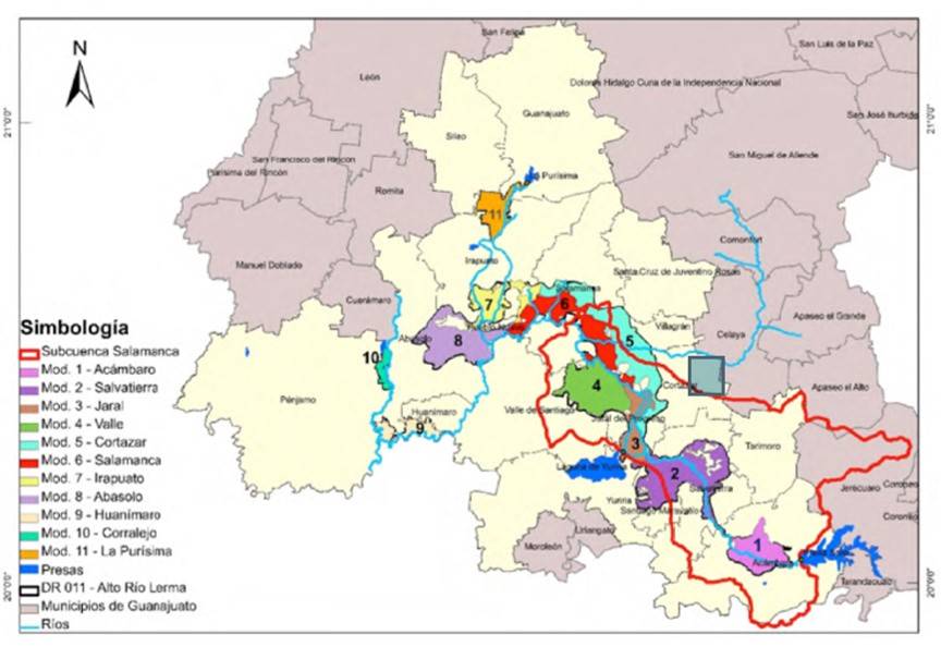 DR 011 is located in El Bajío Guanajuatense; it has 11 associations of irrigation users known as ‘irrigation modules’, which group 26 611 users; it has a total of 111 242.55 ha, of which 110 299.45 are irrigated (Rodríguez-Flores et al., 2019).