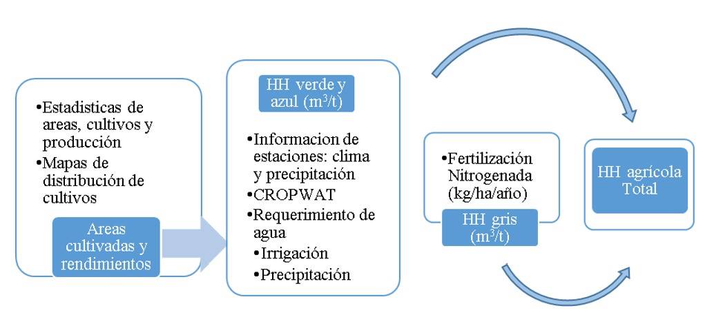 In the second stage, the WF of the process of the crops (agricultural water footprint) with irrigation from the surface supply sources of the 2021-2022 agricultural cycle was estimated, which is composed of the blue, green, and gray water footprint and is expressed in m3 t-1 (Figure 2).