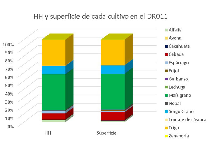 In the WF results of the total production of DR 011 and its sowing area (Figure 3), it was observed that corn and wheat crops have a high weight in terms of total WF, participating with 74% of the total, corn 43% and wheat 31%; nevertheless, the crops accounted respectively for 53% and 22% of the total production of DR 011, in contrast to lettuce, which represents only 0.007% of the total WF with only 0.04% of the total production.