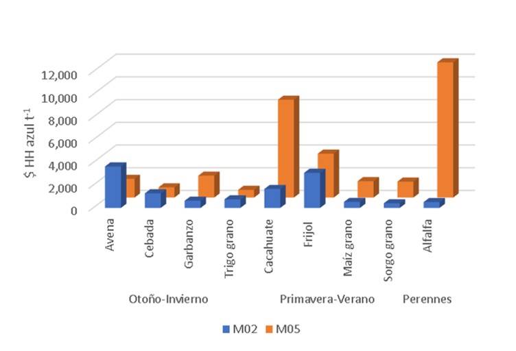 The relationship between the blue WF of crops and the shadow price of surface water obtained from Botello-Aguillón et al. (2022) in modules 02 and 05 was used to determine the value of blue WF per tonne of each crop (Figure 4). Alfalfa, peanut, and bean crops are the most expensive in terms of blue water, mainly because they have low agricultural productivity compared to other modules. One of the characteristics of WF is that it is a spatial and temporal indicator.