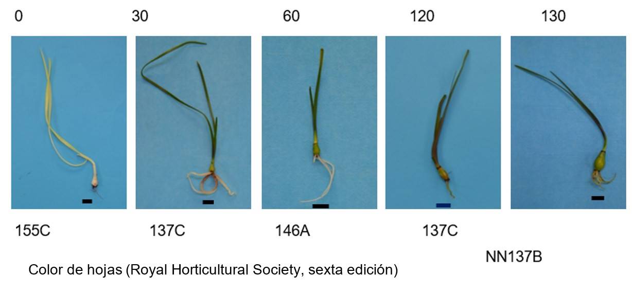 At 80 days after the experiment was established (dae), the concentration of chlorophyll, color, number of leaves and length of the longest leaf were evaluated. In bulbs, width, length, and starch content were measured. In bulbs and leaves, fresh weight, dry weight, and soluble carbohydrate content (total soluble, reducing, sucrose and fructose) were recorded.
