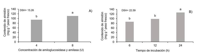 Figure 3 Enzyme concentration and incubation time to estimate starch in in vitro propagated Sprekelia formosissima bulbs. A) effect of enzyme concentration (amyloglucosidase and α-amylase); and B) digestion time at 37 °C. Means with equal letters are not statistically different (Tukey, p≤ 0.05). HSD= honest significant difference.