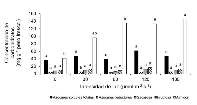 Figure 4 Effect of light intensity on non-structural carbohydrate content in in vitro propagated S. formosissima bulbs. Means with equal letters are not statistically different (Tukey, p≤ 0.05) with honest significant difference (HSD) for total soluble sugars= 33.06; reducing sugars= 3.3; sucrose= 6.38; fructose= 9.38; starch= 68.96.
