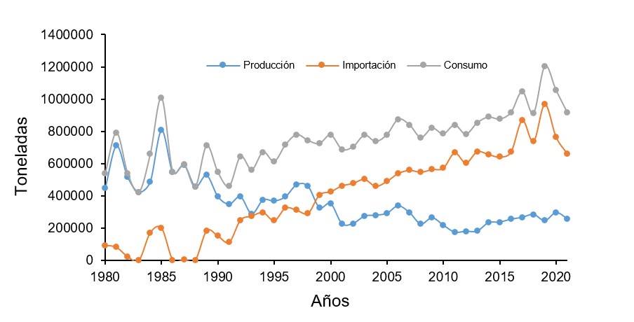 Del mismo modo, se puede notar un incremento acelerado del consumo de arroz al pasar de 538 000 t en 1980 a 915 000 t en 2021, esto equivale a un 70%. Las causas principales del aumento en la demanda se deben a bajos precios de importación y a la creciente población, lo que implica que para abastecer el consumo interno de arroz se recurra a las importaciones debido a la baja producción de este grano (Ibarra, 2016; SIACON, 2023).