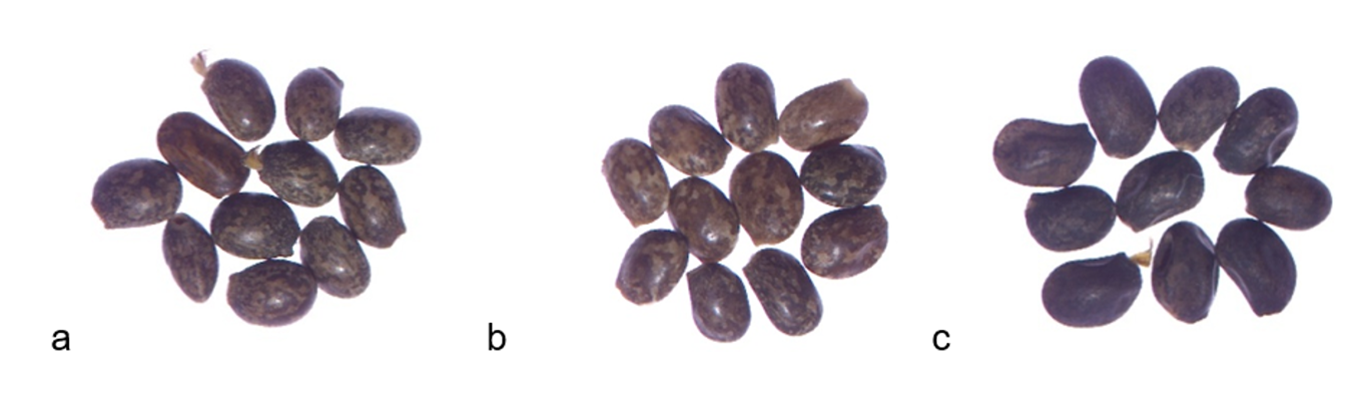 Las semillas fueron separadas de las vainas, secadas a temperatura ambiente y almacenadas aproximadamente durante tres meses a 4 °C en envases de plástico para el análisis de germinación. La Figura 1 muestra las semillas de las tres especies en estudio.