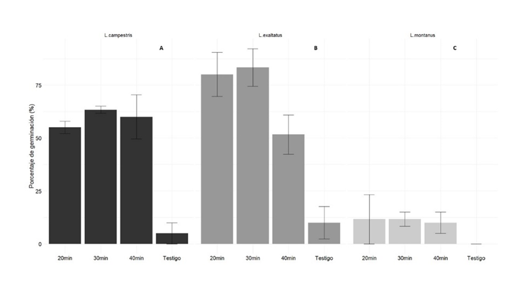 Los resultados obtenidos en semillas de L. montanus, difieren con los obtenidos por Acosta-Perscástegui y Rodríguez-Trejo (2005) en semillas de la misma especie, pero colectadas en el Parque Nacional Cumbres del Ajusco en México, DF a 3 200 msnm., donde con 15 min de exposición al ácido sulfúrico lograron el 100% de germinación en cajas Petri con papel húmedo. Mientras que, para L. campestrisGutiérrez et al. (2010) obtuvieron 50% de germinación con un tiempo de inmersión en ácido sulfúrico de 90 minutos, resultados inferiores a los alcanzados en esta investigación.