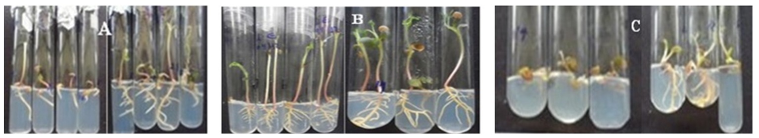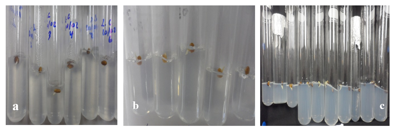 Cada tratamiento de escarificación y crecimiento estuvo compuesto por 20 repeticiones (tubos de ensayo). En cada tubo se colocó una semilla. Los experimentos se replicaron tres veces. A los 15 días de cultivo se evaluó: el número de semillas germinadas y se expresó en porcentaje (%). A los 45 días de cultivo, se evaluaron la longitud de raíz (cm, medida con una regla de 30 cm), longitud de tallo (cm, medido con una regla de 30 cm) y el número de hojas.