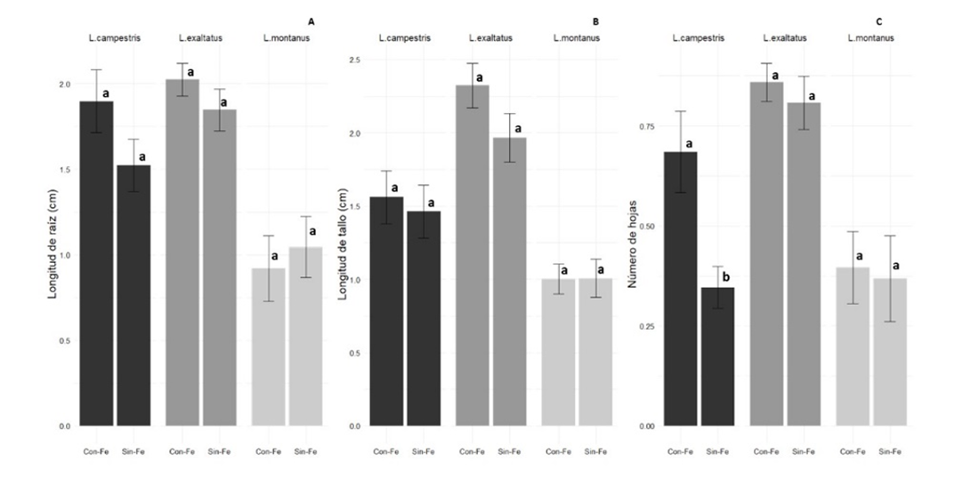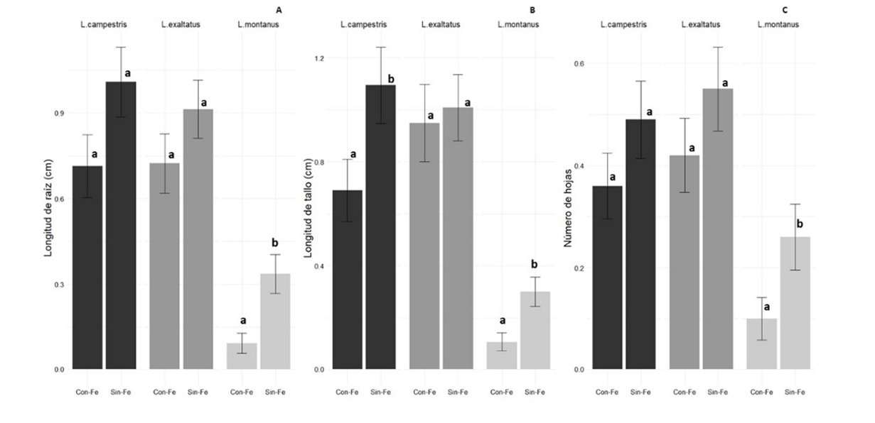 Cuando el medio de cultivo MS contenía Fe-EDTA, la longitud de raíces, longitud de tallo y número de hojas disminuyó en las tres variedades evaluadas. Mientras que, cuando el medio de cultivo no contenía Fe-EDTA las variables evaluadas incrementaron sus valores en las tres variedades L. campestris, L. exaltatus y L. montanus (Figura 4).