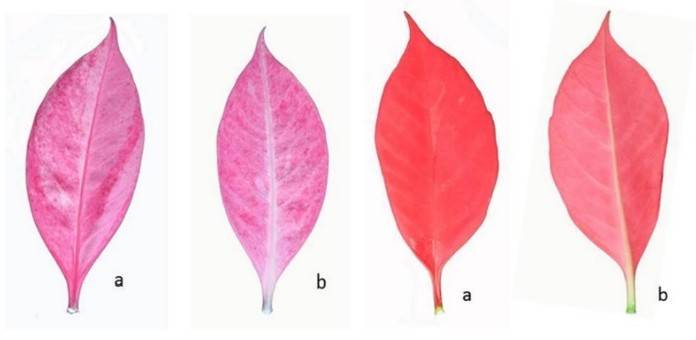 El color principal del haz es rojo (grupo del rojo naranja 51A) y el color secundario es rosa moteado (grupo del rojo naranja 54B) (Figura 3) (RHS, 2006). Presentó un follaje verde intenso que armoniza con las brácteas. Sus hojas tienen una forma oval, de color verde intenso en el haz (grupo de los verdes 139 A) y 139 B (grupo de los verdes) en el envés, sus tallos son lisos verdes fuerte y pigmentación antocianica del tercio superior (Figura 4).