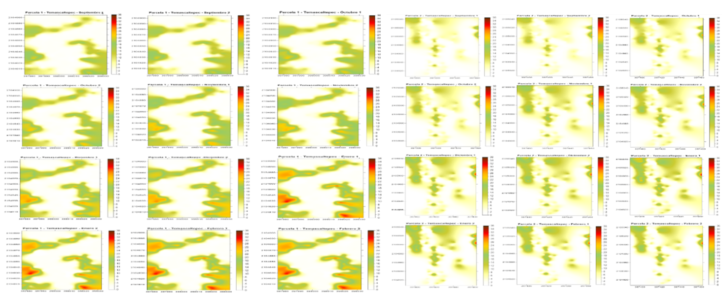 Con respecto el efecto pepita en todos los modelos fue igual a cero, permitiendo considerar que el error fue mínimo y la escala de muestro fue adecuada (Ramírez-Dávila et al., 2011; Tapia-Rodríguez et al., 2020). El alto nivel de la dependencia espacial es conocido a través del valor resultante, de la división del valor del efecto pepita y el valor de la meseta, indicando menos de 25% en todos los muestreos.