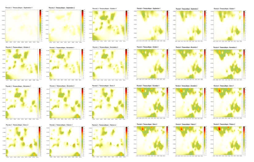 Con la técnica del krigeado ordinario, se pueden visualizar los centros de agregación, llegando a conocer en tiempo real su comportamiento, permite visualizar la variabilidad poblacional, pudiendo conducir el manejo con precisión con dichos mapas.