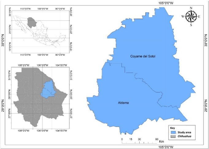 The research was carried out in Coyame del Sotol and Aldama municipalities in the state of Chihuahua, Mexico (Figure 1). The predominant shrub vegetation is composed of desert microphyllous and rosetophytic shrubs, with a predominance of Euphorbia antisyphilitica, Agave lechuguilla Torr., Larrea tridentata DC. Coville, and Dasylirion sp. (Granados-Sánchez et al., 2011). The altimetric altitudes of the area range between 940 and 1 500 m; the average annual rainfall is 200 to 400 mm and the average annual temperature is 24 °C (Granados-Sánchez et al., 2011; González-Medrano, 2012).