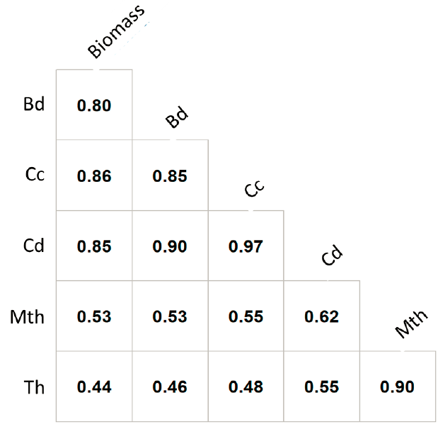 The correction was performed with the Cochrane Orcutt test. Correcting for autocorrelation led to reliable estimates for biomass prediction (Table 6). Durbin-Watson test increased 2.19 for the two selected equations. The Breusch-Pagan test indicated the absence of heteroscedasticity: BP=3.689, p value=0.15 and BP=3.286, p value= 0.47 for Equations 2.2 and 3.2, respectively.
