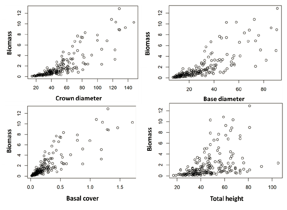 The independent variables of candelilla plants showed a good correlation with biomass, mainly crown cover, crown diameter and base diameter. Total height and average height exhibited a weaker relationship. In this regard, it should be noted that, unlike in most tree species, whose biomass and volume prediction is made with data on the height and diameter of individuals, in shrub taxa there are other predictor variables that depend on the shape of the plant.