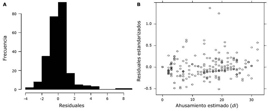 El cumplimiento de los supuestos de regresión se llevó a cabo mediante las pruebas gráficas de normalidad en la frecuencia de los residuos, distribución homocedástica de los residuales y la autocorrelación de los errores (Martínez-González et al., 2014). De igual manera, se verificó la distribución de los valores aleatorios de los parámetros por árbol obtenida en el ajuste de MEM.