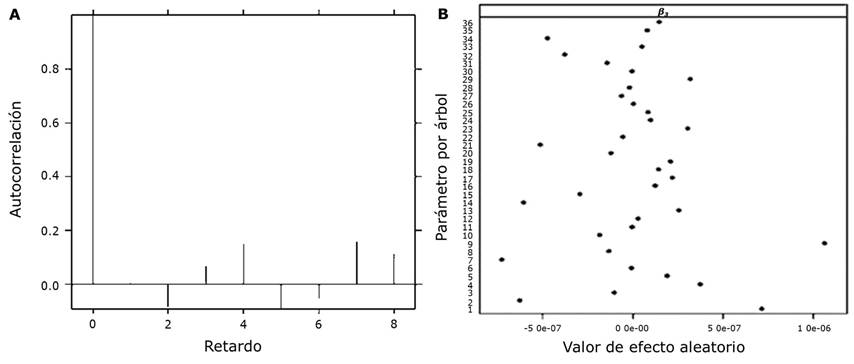 A = Autocorrelación de los residuales; B = Distribución de los valores aleatorios de los parámetros árbol por árbol.