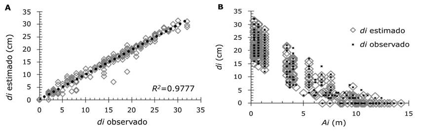 Aun cuando la presencia de varianza no constante en la distribución de residuales (heterocedasticidad) es común al relacionar variables biológicas, no invalida los estimadores obtenidos por MCNL, ya que continúan siendo insesgados y dejan de tener una varianza mínima (Hernández et al., 2013); el enfoque de MEM aplicado en el presente estudio fue viable para la corrección de ese problema al modelar el di. En este sentido, Cruz-Cobos et al. (2008) al utilizar los MEM, flexibilizaron un modelo lineal polinómico e incrementaron la capacidad predictiva de la expresión di de Cielito 1 para árboles de Pinus cooperi C. E. Blanco en Durango, México.