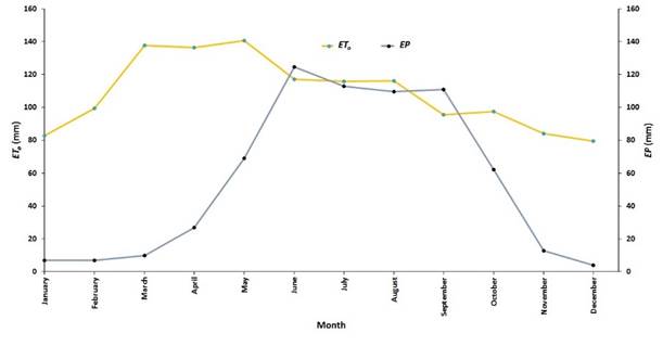 The average ET o obtained using CROPWAT for the year of 2017, applying the Penman-Monteith method, was 4.1 mm day-1. The greatest ETo occurred during the hottest months, corresponding to the period from March to May. The period with greatest effective rainfall was the summer cycle, during the months of June to September (124.7 to 110 mm). This means that the quantity of water used by the plants was greater during the summer months, giving an impression of benign conditions in the region for agricultural production during the period from May to October, when EP is greater than ET o (Figure 2).