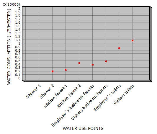 Figure 1 Dispersion of water consumption in the 1 tourist whereabouts with well water supply. Source: Own elaboration. Note: Shower 1 has a consumption of 120 000 L/Bimester.