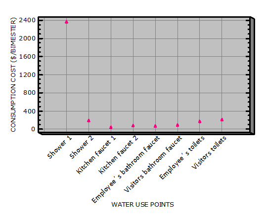 In Figure 4are the points of use of water for the whereabouts with well water supply, the cost of the majority is due to higher volumes to 12.000 liters consumed in the showers. Thus, the cost amounts to $3,254.54 pesos per quarter in low season. It should be noted that subsequent to the verification activities would be implemented activities of reuse and decrease in consumption, for example, the uptake of the water of the showers and the swimming pool to bring them to storage tanks and reuse in the download of the toilets of the baths.